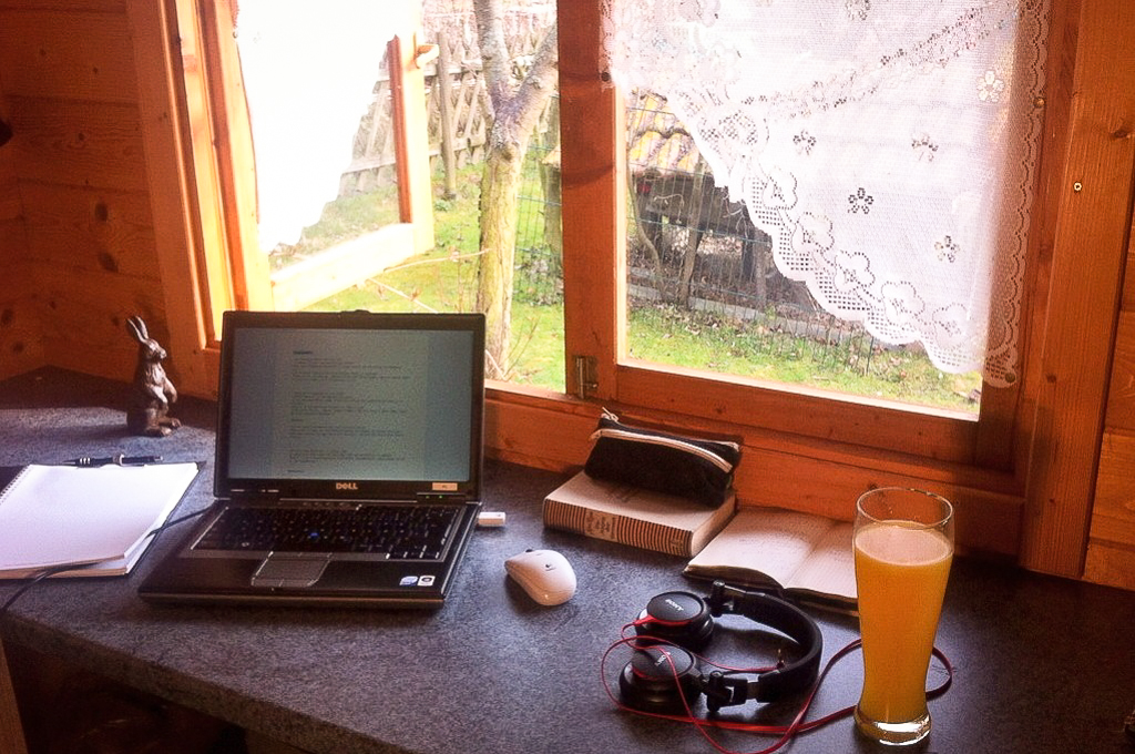 Das Thüringer Teilzeitbüro im Frühjahr 2014 war für vieles gut: Blick in das Gartenidyll, frische Gedanken über kalten Waden und den letzten Schliff am Treiben um Moritz, Ivahn & Co.